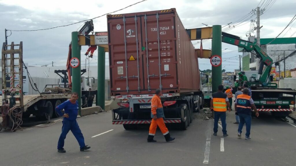 Manaus – A Prefeitura de Manaus, por meio do Instituto Municipal de Mobilidade Urbana (IMMU) e da Secretaria Municipal de Infraestrutura (Seminf), realizou, neste sábado, 25/2, a retirada de duas estruturas do limitador de altura da passagem subterrânea do Complexo Viário Ministro Roberto Campos, no sentido João Valério para o São Jorge. As estruturas foram danificadas após uma carreta da empresa Oliva Pinto Logística se chocar com o limitador.