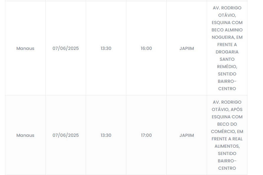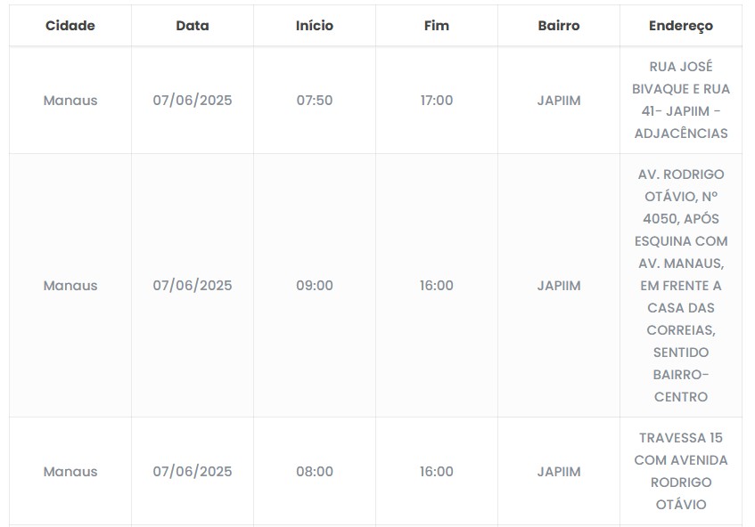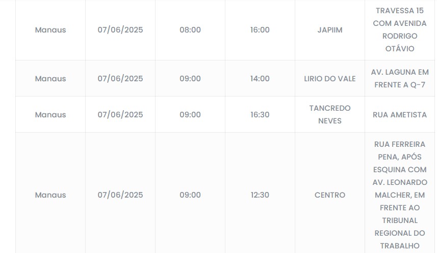 No bairro Japiim, as interrupções começam às 7h50, na Rua José Bivaque e Rua 41, com duração prevista até as 17h. Outras áreas do bairro, como a Avenida Rodrigo Otávio, em trechos próximos à Casa das Correias, à Drogaria Santo Remédio e ao Beco do Comércio, terão cortes entre 9h e 17h. A Travessa 15, também no Japiim, ficará sem energia das 8h às 16h. No Lírio do Vale, a Avenida Laguna, em frente à quadra Q-7, será afetada das 9h às 14h. Em Tancredo Neves, a Rua Ametista terá interrupção das 9h às 16h30. Já no Centro, a Rua Ferreira Pena, próximo à Avenida Leonardo Malcher e ao Tribunal Regional do Trabalho, ficará sem energia das 9h às 12h30.