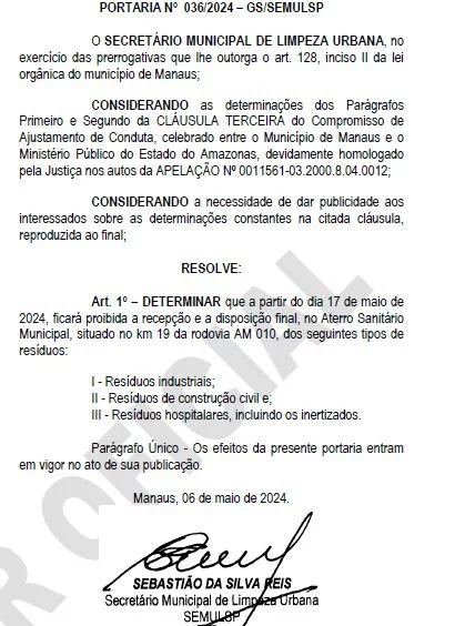 A decisão, segundo o documento, é uma resposta ao Compromisso de Ajustamento de Conduta (TAC) estabelecido entre a Prefeitura de Manaus e o Ministério Público do Amazonas (MPAM). O TAC, homologado pela Justiça, é parte integrante das ações para aprimorar a gestão ambiental e sanitária da cidade.