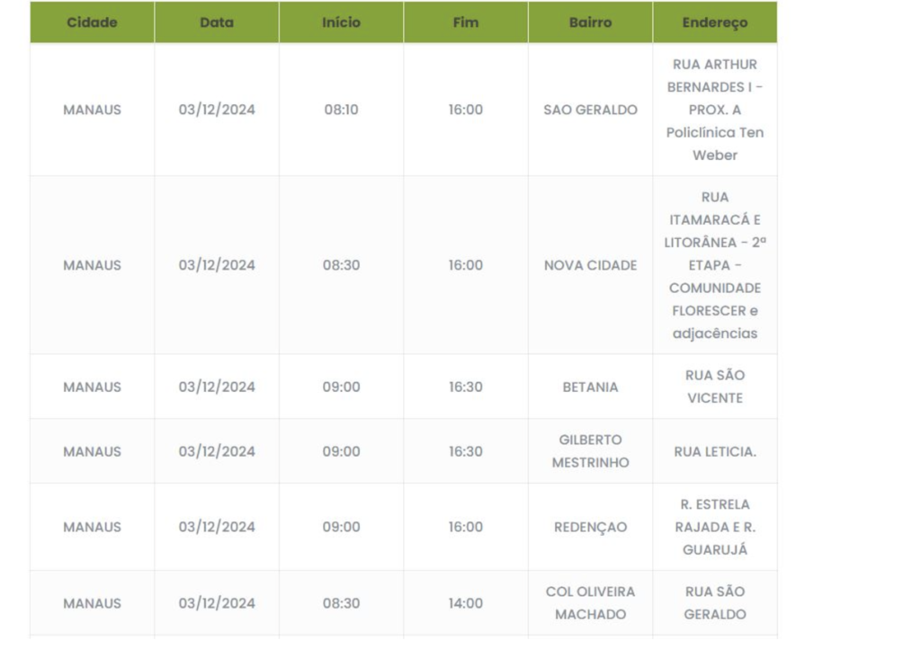 Manaus – A Amazonas Energia informou que, nesta terça-feira (3), ruas e avenidas de sete bairros da capital amazonense terão o fornecimento de energia interrompido para que sejam realizados serviços de manutenção na rede elétrica.