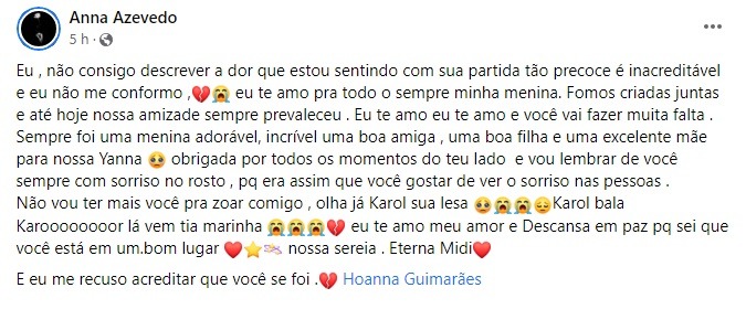 Nas redes sociais, foram inúmeras homenagens à Hoanna daqueles que a amam e sentem muito a sua partida.
