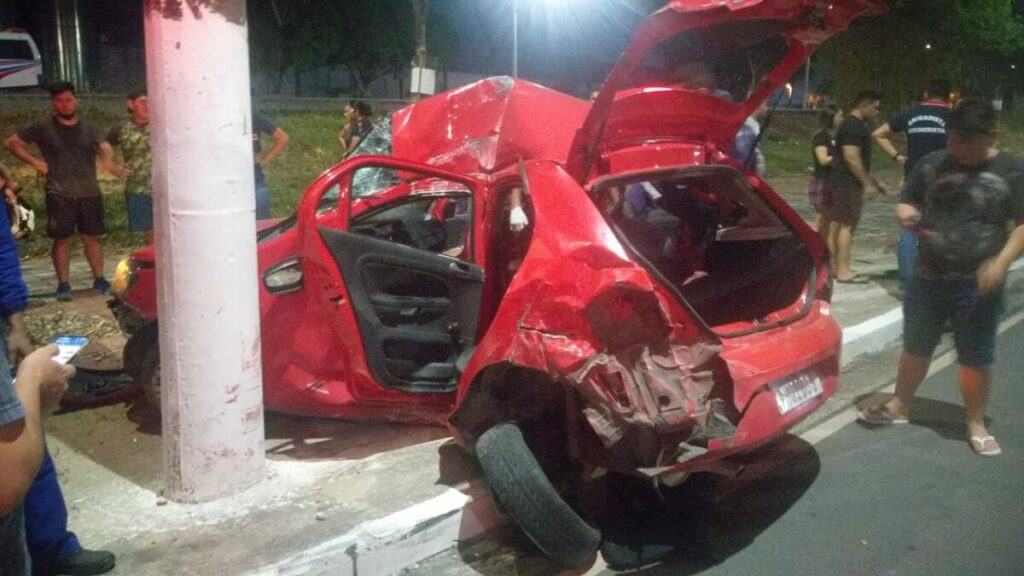 Um outro veículo, que trafegava em alta velocidade, colidiu violentamente contra a traseira do Gol vermelho que o motorista de app dirigia.