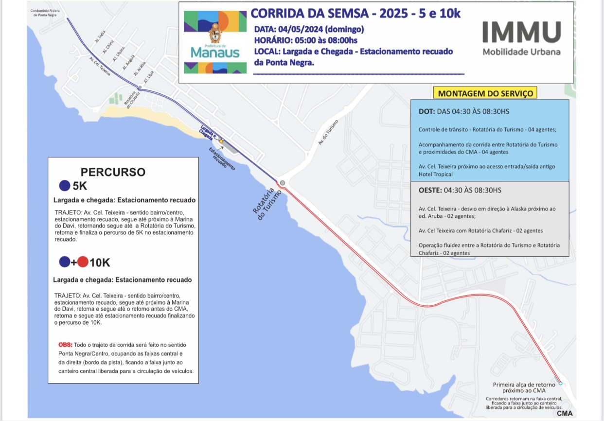 Manaus – A Prefeitura de Manaus, por meio do Instituto Municipal de Mobilidade Urbana (IMMU), montou uma estrutura especial de trânsito para este domingo, 4/5, quando será realizada a corrida “Manaus em Movimento 2025”, com largada às 5h30, no estacionamento recuado do complexo turístico Ponta Negra, zona Oeste. Agentes de trânsito atuarão na orientação aos motoristas para garantir a segurança dos pedestres durante as travessias e circulações.