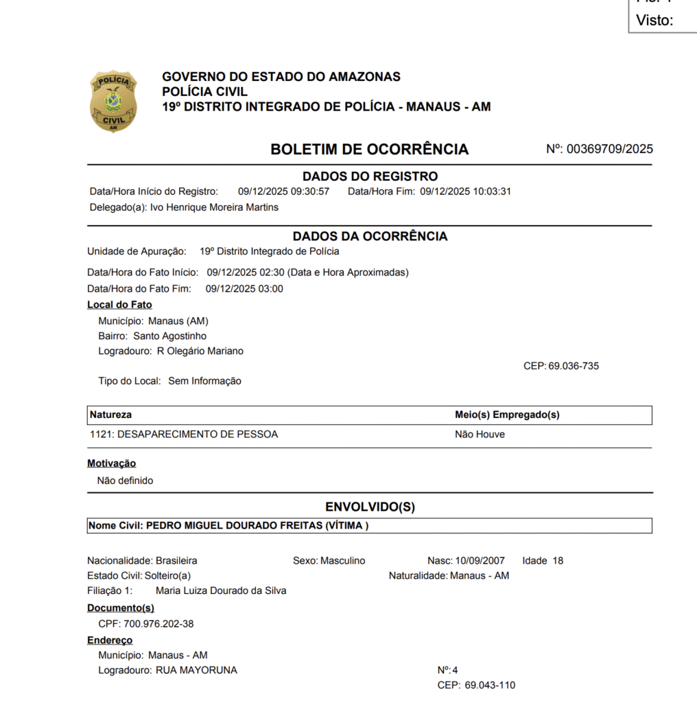 Amazonas – Familiares de Pedro Miguel Dourado Freitas,18, estão em busca de informações sobre o paradeiro do jovem, que está desaparecido desde o último domingo, 7.
