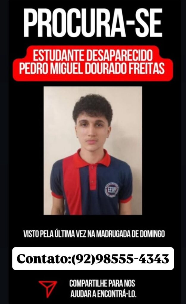 Quem tiver alguma informação sobre Pedro Miguel Dourado Freitas pode entrar em contato pelo telefone (92) 98555-4343.