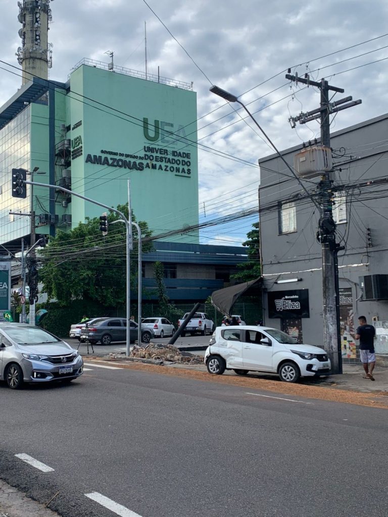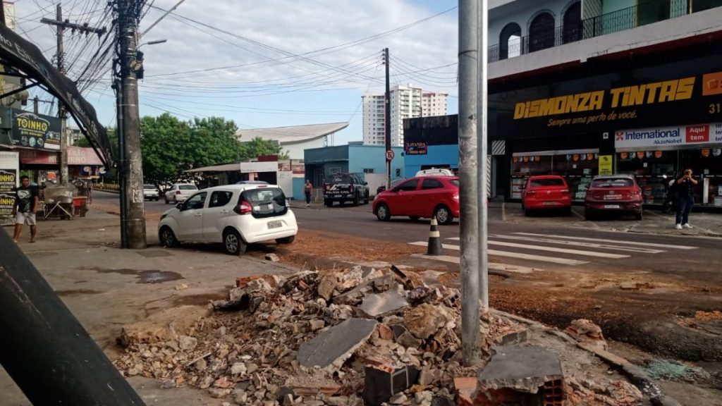 O impacto da colisão foi tão forte, que o Mobi acabou invadindo a área em frente a um comércio que já tinha sido destruída por um outro acidente na manhã de quinta-feira (14), na Major Gabriel.