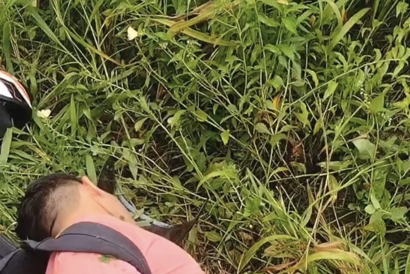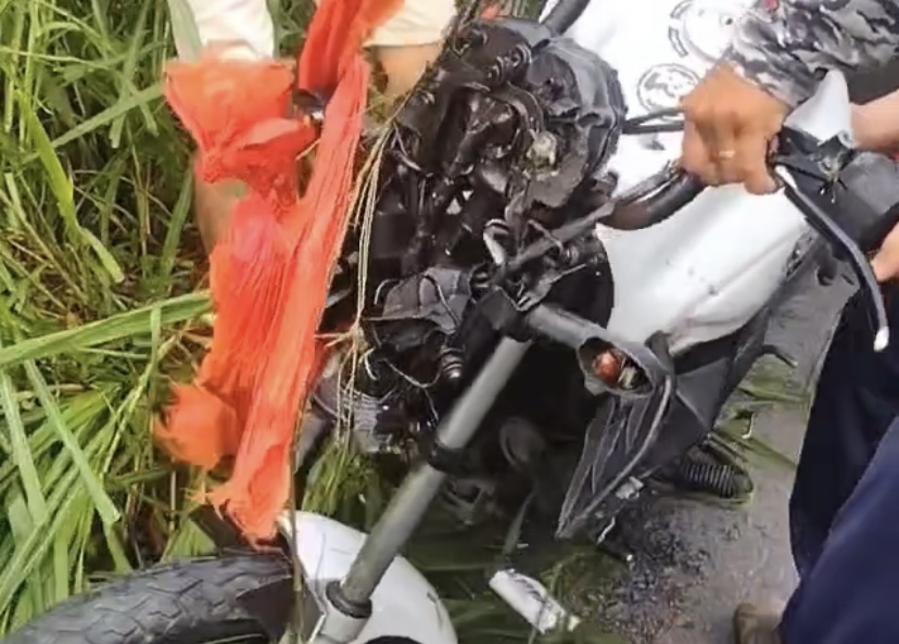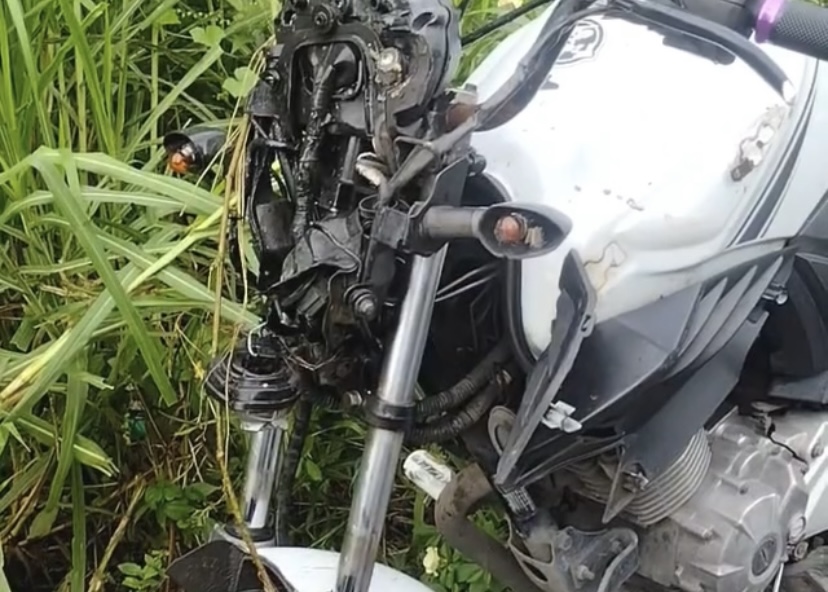 A motocicleta despencou dentro do bueiro e por pouco ele também não caiu junto com o veículo. Ele foi encontrado jogado em uma área de mata com o impacto da colisão.