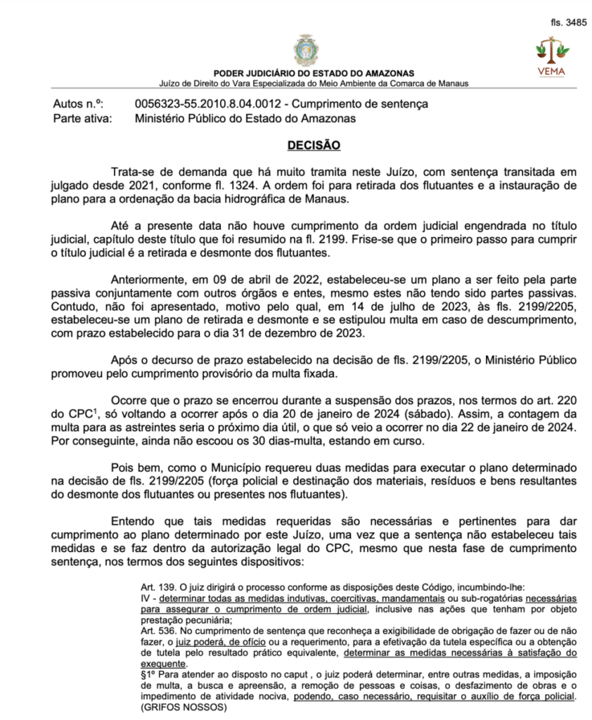 Com isso, o juiz suspendeu a multa a ser aplicada e ordenou que seja”disponibilizado força policial necessária para a retirada e o desmonte dos flutuantes” do local.