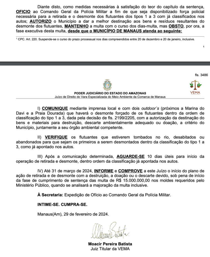 O prazo para informar e cumprir à justiça a ação de retirada e desmonte dos flutuantes é no dia 31 de março deste ano e caso contrário, o município vai ter que pagar a multa R$ 15 milhões.