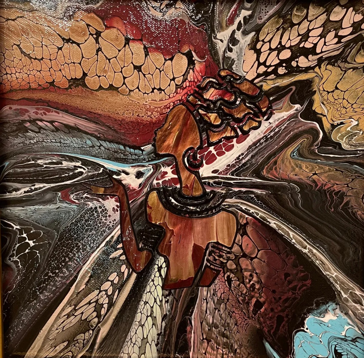“Yansan Yoruba Goddness of the Wind” (acrílico de 12″ x 12″ em painel de madeira) retrata a silhueta de uma mulher da cintura para cima em um vestido africano. Gaby reflete que Neves, por mais intenso que fosse o clima, sempre honraria seu país na maneira como se vestia. A silhueta, centrada na obra, destaca-se entre o fundo fluido, que tem tons de terra rodopiando como o vento. Todos os elementos parecem fluir de sua imagem enquanto ainda aparecem como elementos naturais.