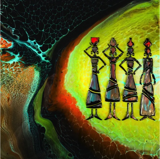 A estabilidade que Gaby encontrou em sua cultura com Neves pode ser vista em “A Força que Nunca Seca”, (também acrílico 12″ x 12″ sobre painel de madeira). Este trabalho tem quatro mulheres segurando e equilibrando objetos em suas cabeças, aparecendo como o epítome da resiliência e força. Cada mulher em uma posição diferente, embora todas em pé, emergem como pilares com o derramamento de acrílico girando em torno deles, dando-lhes espaço e abrigo.