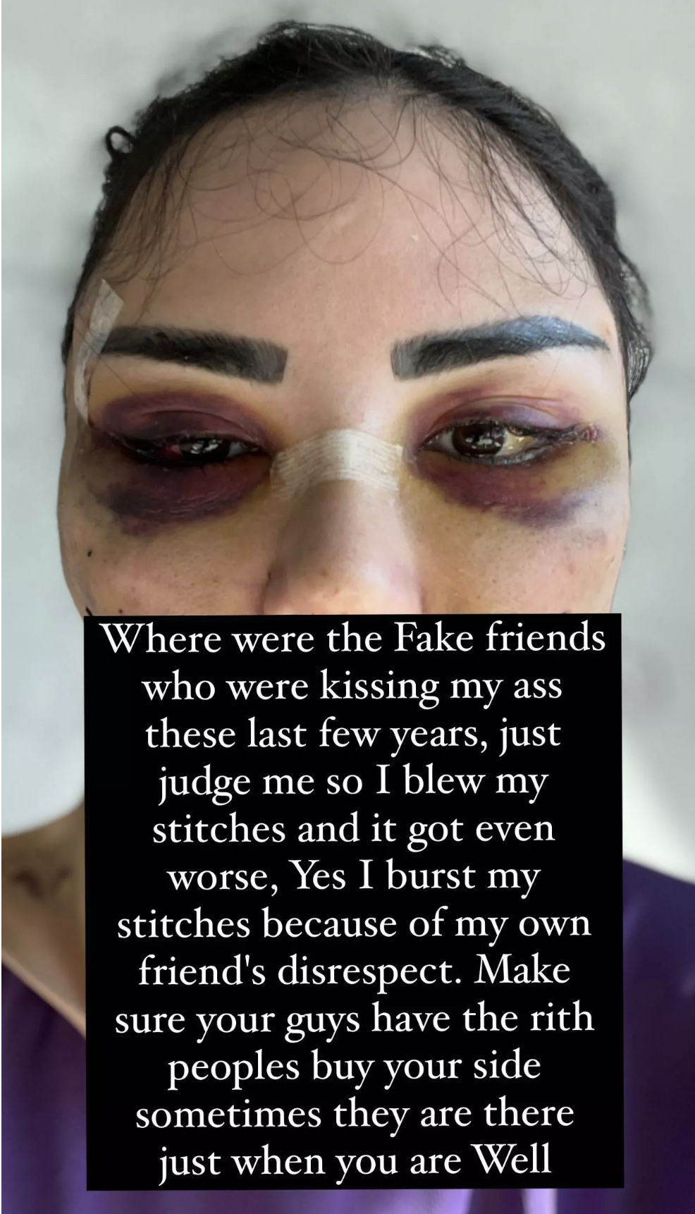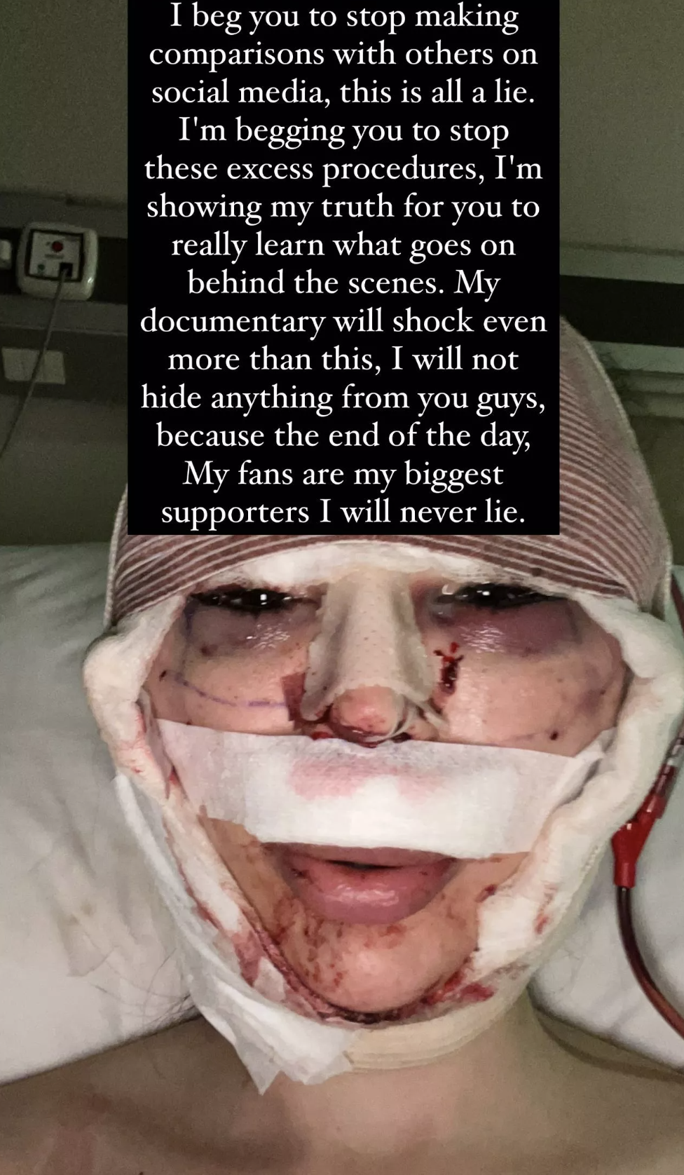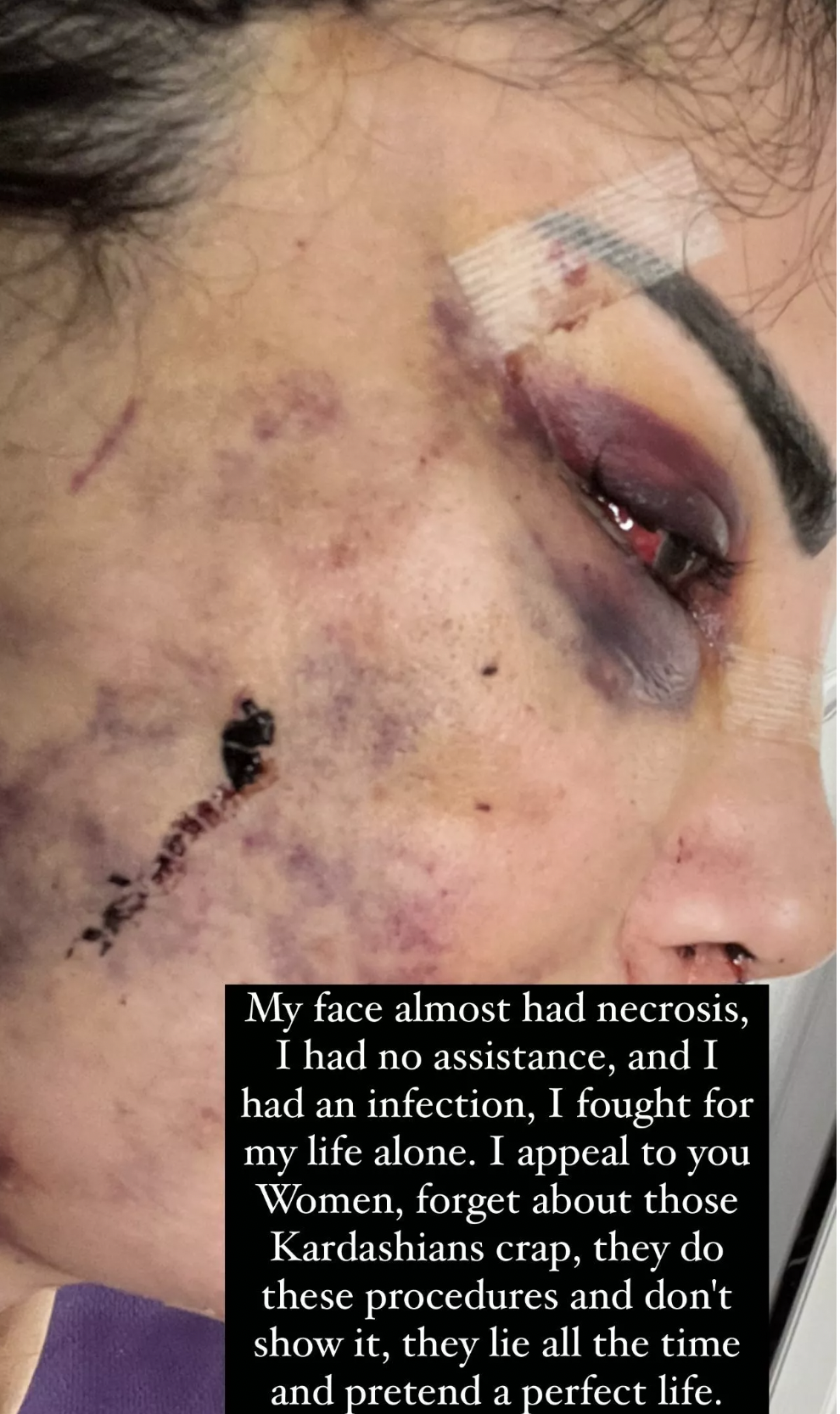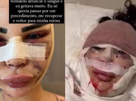Com uma série de fotos com hematomas, cortes e inchaços no rosto, que teriam sido causados pelas intervenções cirúrgicas, ela usou a web para denunciar que foi vítima de maus-tratos.