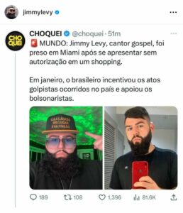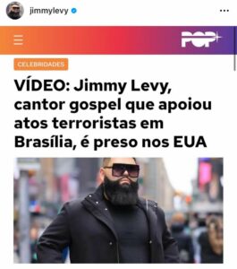 Mundo – O cantor gospel Jimmy Levy, que recentemente participou de uma celebração religiosa em Miami, nos Estados Unidos, foi alvo de notícias falsas na mídia brasileira. Segundo o artista, os veículos de comunicação distorceram a realidade ao afirmar que ele foi preso e é um extremista de direita.