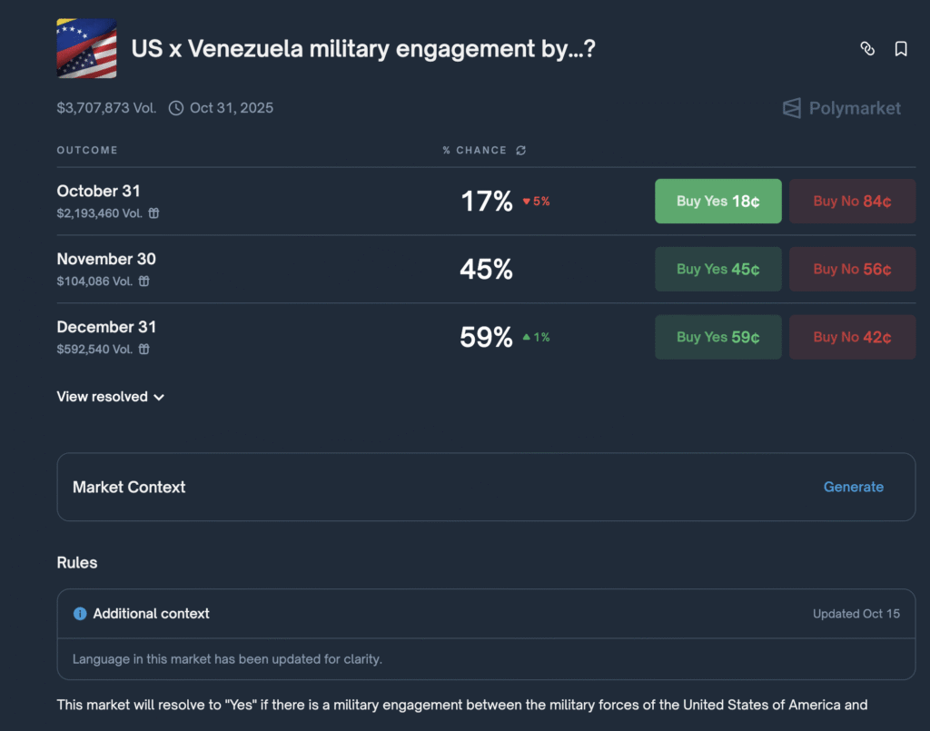 Mundo – Enquanto a tensão entre Washington e Caracas atinge novos picos, um mercado de previsão descentralizado de alto volume, o Polymarket, está precificando um risco crescente de confronto. De acordo com os dados de negociação mais recentes, a probabilidade de um “envolvimento militar entre os EUA e a Venezuela” acontecer até 31 de dezembro de 2025 cresceu para 59%.