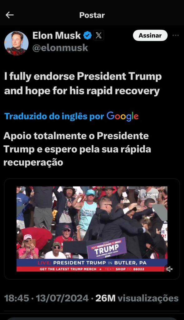 A postagem rapidamente ganhou grande visibilidade, acumulando 26 milhões de visualizações em poucas horas. A imagem anexada mostra uma multidão em um comício de Trump, realizado em Butler, Pensilvânia, com cartazes de apoio e o slogan “Make America Great Again” em destaque.