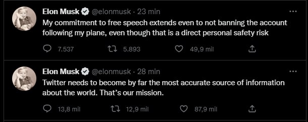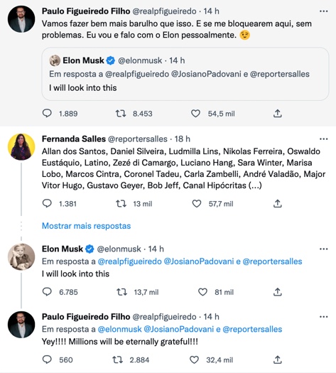 Mundo – O empresário Elon Musk, novo dono do Twitter, afirmou neste domingo (6), que vai examinar supostos casos de censura na plataforma contra influenciadores e políticos do Brasil. O comentarista da rádio Jovem Pan Paulo Figueiredo Filho marcou o bilionário em uma publicação reclamando da falta de liberdade de expressão no País, citando contas que foram derrubadas por decisão da Justiça. Musk respondeu: “Vou dar uma olhada nisso”.