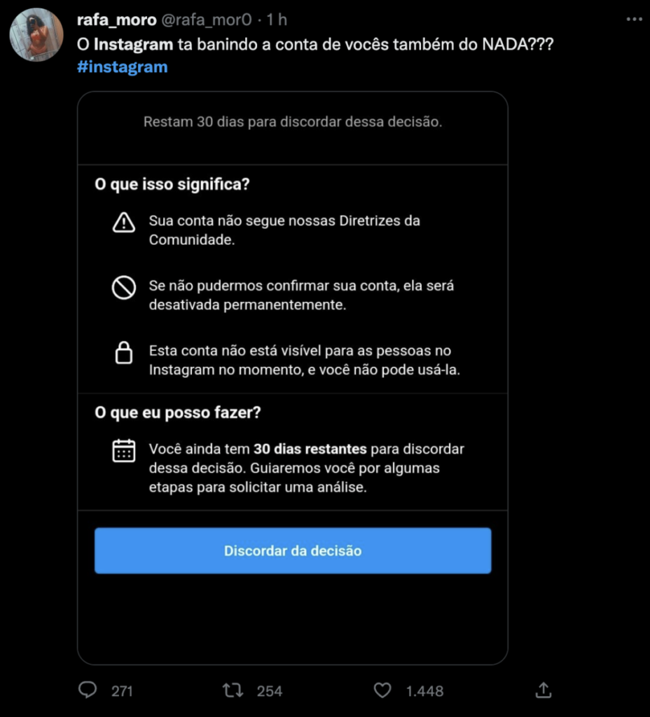 Mundo – Na manhã desta segunda-feira (31), alguns usuários do Instagram relataram no Twitter que suas contas na plaforma foram suspensas por 30 dias, passível até de exclusão.