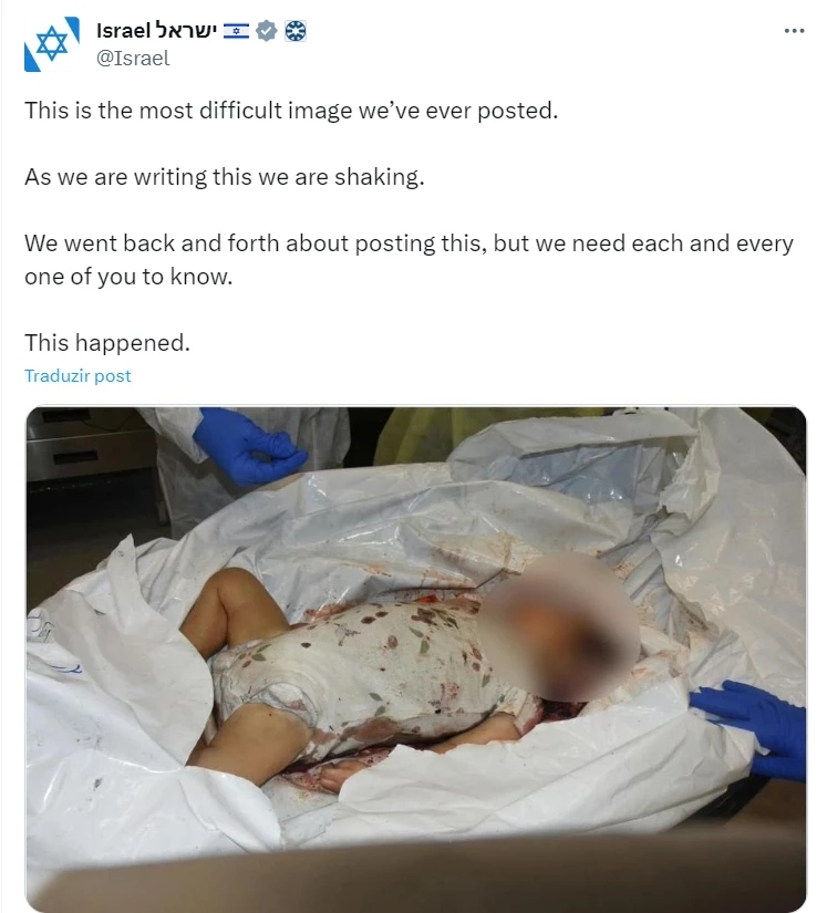 Mundo – O governo de Israel publicou nesta quinta-feira (12) uma imagem que comprova as afirmações feitas por militares do país e noticiadas nos últimos dias: a de que bebês foram assassinados, e alguns deles decapitados, pelo grupo terrorista Hamas. A postagem em questão, feita por um perfil na rede X (antigo Twitter) administrado pelo Ministério das Relações Exteriores israelense, mostra uma criança assassinada.