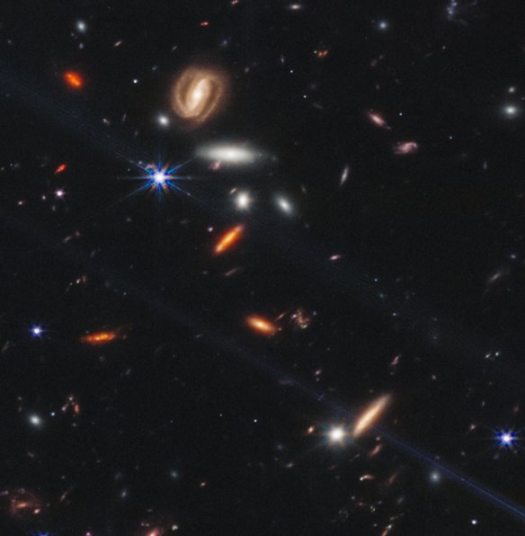 A agência espacial explica que a imagem, a primeira de uma série que o Webb deve divulgar em breve, abrange um pedaço de céu que, para um observador terrestre, parece do tamanho de um grão de areia mantido à distância de um braço.