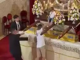 Mundo - Um homem interrompeu uma missa após ter entrado correndo em uma igreja com uma criança nos ombros em…