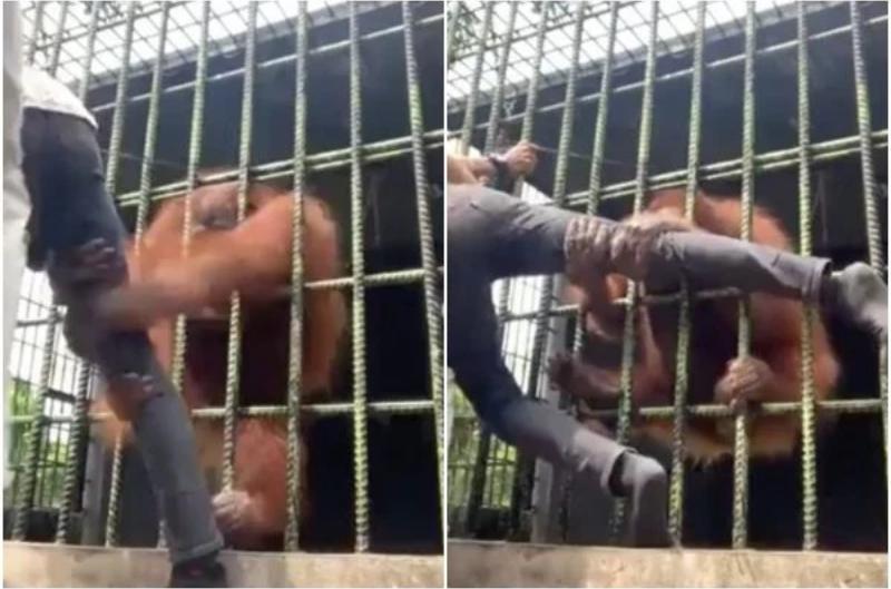 Mundo - Um orangotango quase quebrou a perna de um homem ao tentar arrastá-lo para uma jaula de um zoológico…