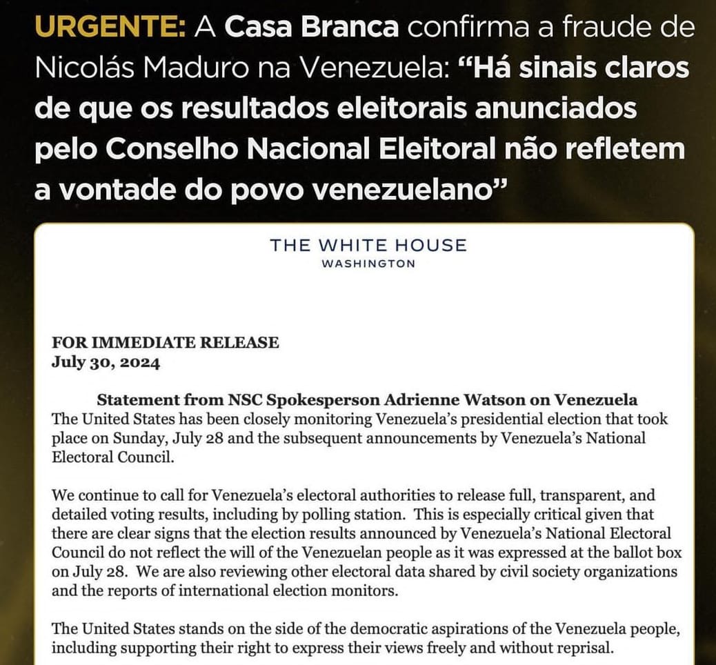 Mundo – Nesta terça-feira (30) o site da Casa Branca dos Estados Unidos da América emitiu uma nota referente as eleições na Venezuela. porta-voz da residência oficial do presidente Joe Biden, Adrienne Watson, confirmou que há fortes indícios de fraude nas recentes eleições presidenciais da Venezuela, lideradas pelo presidente Nicolás Maduro.