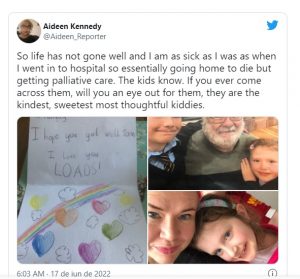 “ENTÃO A VIDA NÃO CORREU BEM E ESTOU TÃO DOENTE QUANTO ESTAVA QUANDO FUI PARA O HOSPITAL, ESSENCIALMENTE INDO PARA CASA PARA MORRER, MAS RECEBENDO CUIDADOS PALIATIVOS. AS CRIANÇAS SABEM. SE VOCÊ SE DEPARAR COM ELES, VOCÊ VAI FICAR DE OLHO NELES, ELES SÃO AS CRIANÇAS MAIS GENTIS, DOCES E ATENCIOSAS”.