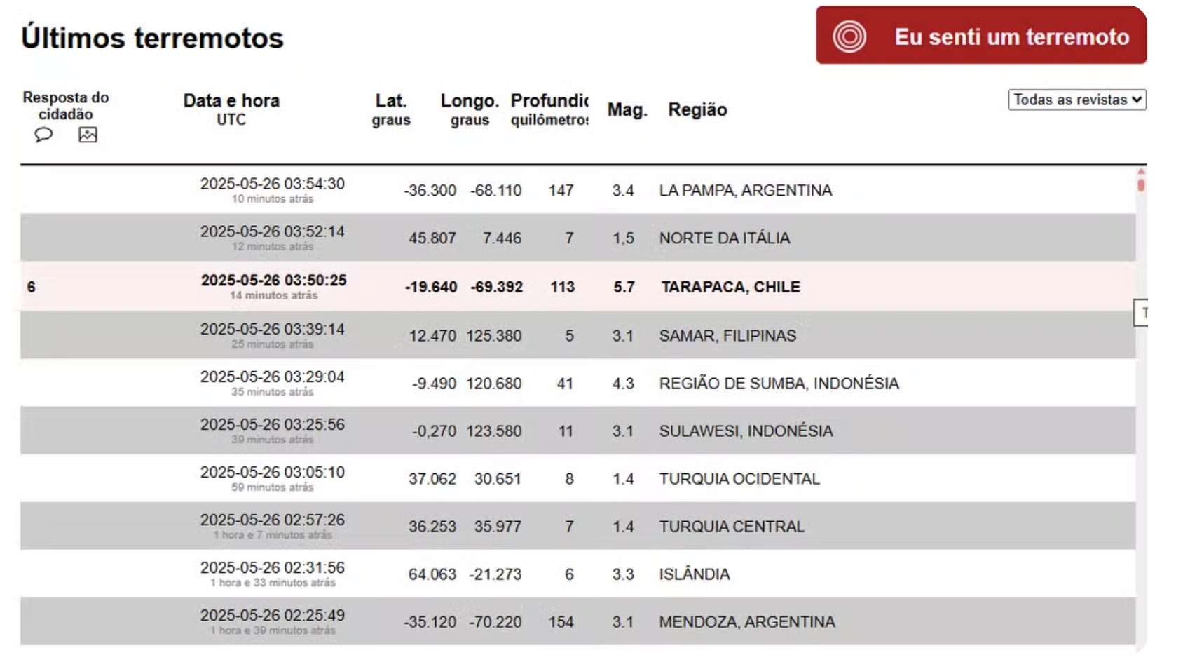 Mundo – Na noite deste domingo (25), um terremoto de magnitude 5,8 atingiu a região de Tarapacá, localizada no norte do Chile. A informação foi divulgada pelo Centro Sismológico Euro-Mediterrânico (EMSC), que monitora a atividade sísmica em tempo real.