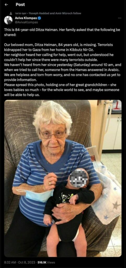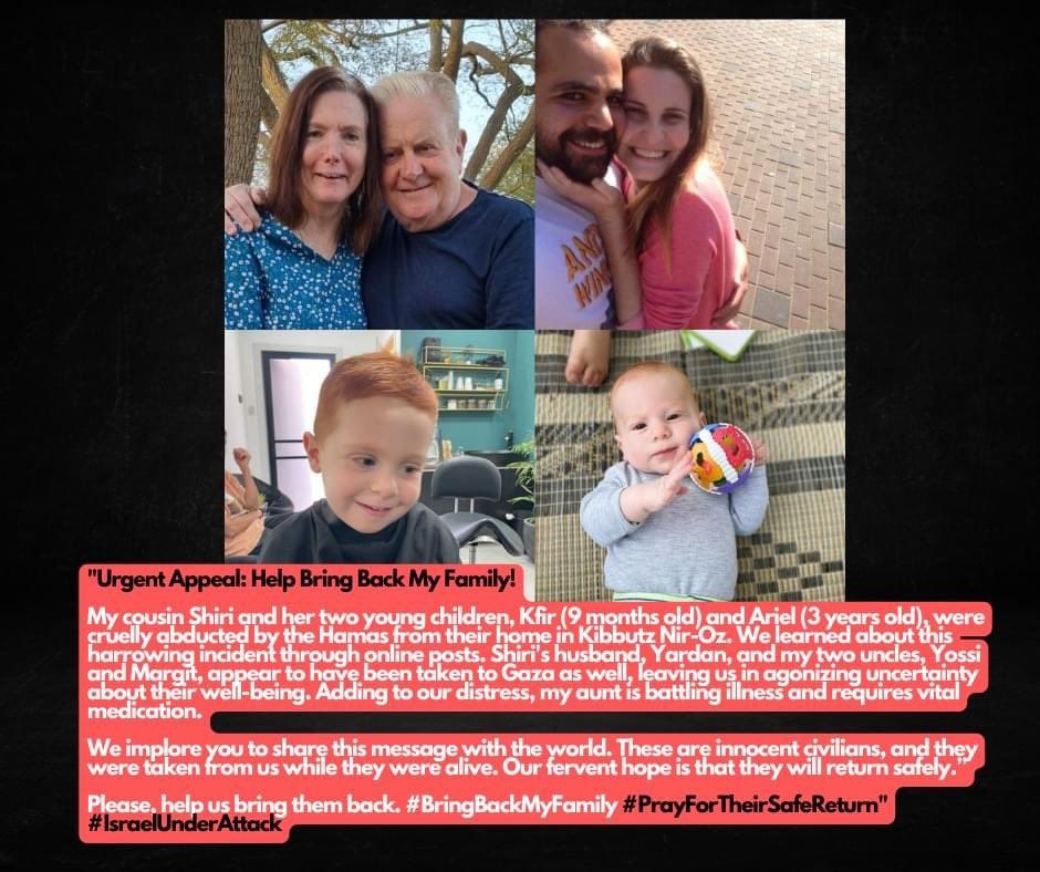 Além da atrocidade cometida contra os bebês, famílias inteiras em Beeri, Kfar Aza e Nir Oz foram assassinadas e raptadas. Algumas postagens nas redes sociais fazem apelos pelos desaparecidos. Veja: