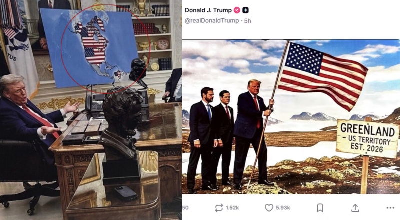 A primeira postagem exibe uma foto aparentemente alterada do Salão Oval, capturada originalmente durante uma reunião com líderes europeus (incluindo Emmanuel Macron, Keir Starmer e Ursula von der Leyen) sobre a Ucrânia, em agosto de 2025. No fundo da imagem editada, um mapa apresenta o Canadá inteiro, a Groenlândia (território autônomo da Dinamarca) e a Venezuela pintados nas cores da bandeira americana — vermelho, branco e azul —, sugerindo incorporação ao território dos Estados Unidos.