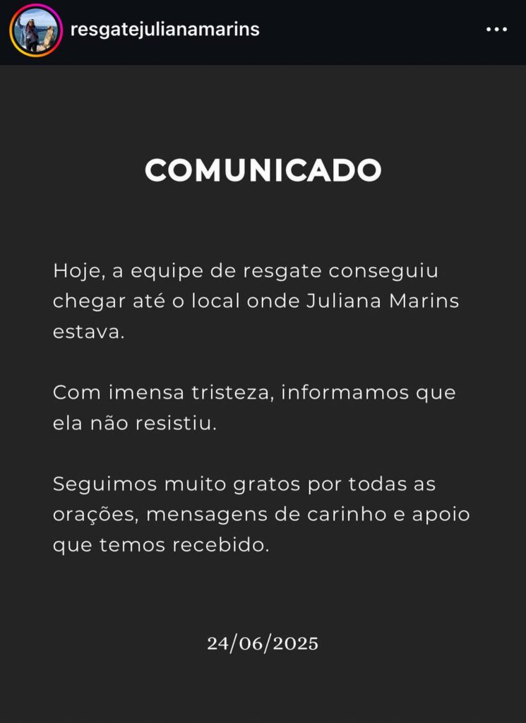 A família de Juliana, que criou o perfil no Instagram @resgatejulianamarins para pressionar por buscas e desmentir informações falsas, como alegações de que ela havia recebido suprimentos, confirmou a trágica notícia. As operações de resgate, marcadas por interrupções devido ao mau tempo e falhas logísticas, como cordas inadequadas, não conseguiram alcançar Juliana a tempo.