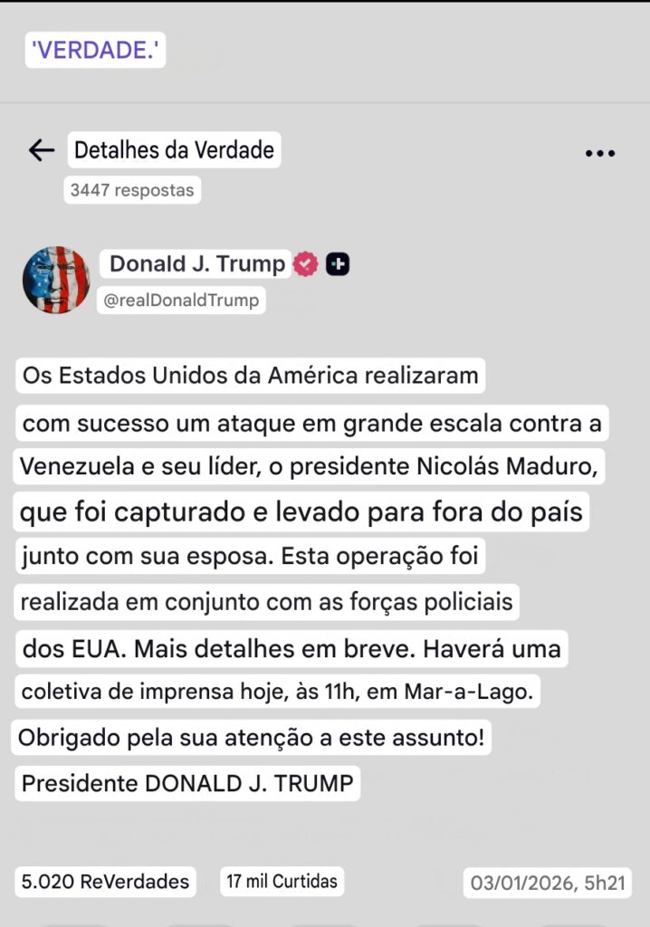 O anúncio ocorre em um momento de extrema tensão, após meses de escalada retórica entre Washington e o regime de Caracas. A confirmação da captura de Maduro cria um vácuo de poder imediato na Venezuela, gerando incertezas sobre quem assumirá o controle das forças armadas e das instituições do país nas próximas horas.