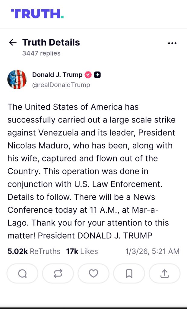 De acordo com o pronunciamento oficial da Casa Branca, a operação foi classificada como uma “missão de restauração democrática e justiça”. Trump afirmou que Maduro não se encontra mais em território venezuelano, tendo sido transportado para um local não revelado para enfrentar acusações internacionais.