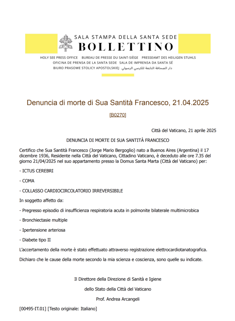 Certifico que Sua Santidade Francisco (Jorge Mario Bergoglio), nascido em Buenos Aires (Argentina) a 17 de dezembro de 1936, residente na Cidade do Vaticano, Cidadão do Vaticano, faleceu às 7h35 de 21.abr.2025 no seu apartamento na Domus Santa Marta (Cidade do Vaticano) de: