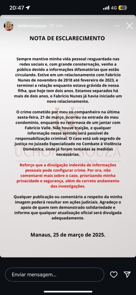 Manaus – – A advogada Kellen Clyssya quebrou o silêncio nesta terça-feira (25) ao emitir uma nota de esclarecimento à imprensa sobre os eventos turbulentos que tomaram conta de sua vida na última semana. O caso, que chocou moradores de um condomínio na capital amazonense, envolve uma tentativa de homicídio praticada por seu ex-companheiro, Fabrício Nunes, contra Fabrício do Vale, em um ataque motivado por ciúmes e inconformismo com o fim do relacionamento.