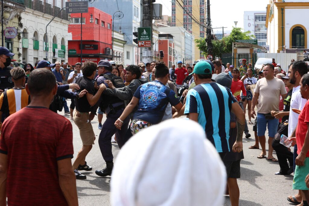 Manaus – Agentes da Guarda Municipal de Manaus foram agredidos nesta quinta-feira (7/8) por ambulantes que atuavam de forma irregular e vendendo produtos fora da validade no Centro da cidade. A ação ocorreu durante a continuidade do programa “Mutirão no Bairro”, que tem promovido o reordenamento da área central da capital amazonense. Dois servidores públicos tiveram ferimentos graves, incluindo cortes na cabeça, e vídeos que circulam nas redes sociais mostram um dos guardas com o rosto ensanguentado. Além das agressões, servidores da Prefeitura relataram ameaças feitas por membros de facções criminosas que estariam infiltrados entre os ambulantes.
