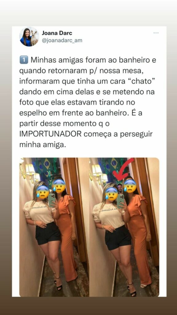 A deputada conta que a perseguição com sua amiga começou antes mesmo dela chegar no evento. A vítima registrou que o assediador começou a perseguí-la e tentou intimidar ela e outra mulher no banheiro do estabelecimento. Ao tirarem fotos para as redes sociais, o homem apareceu ao fundo como um “stalker”.