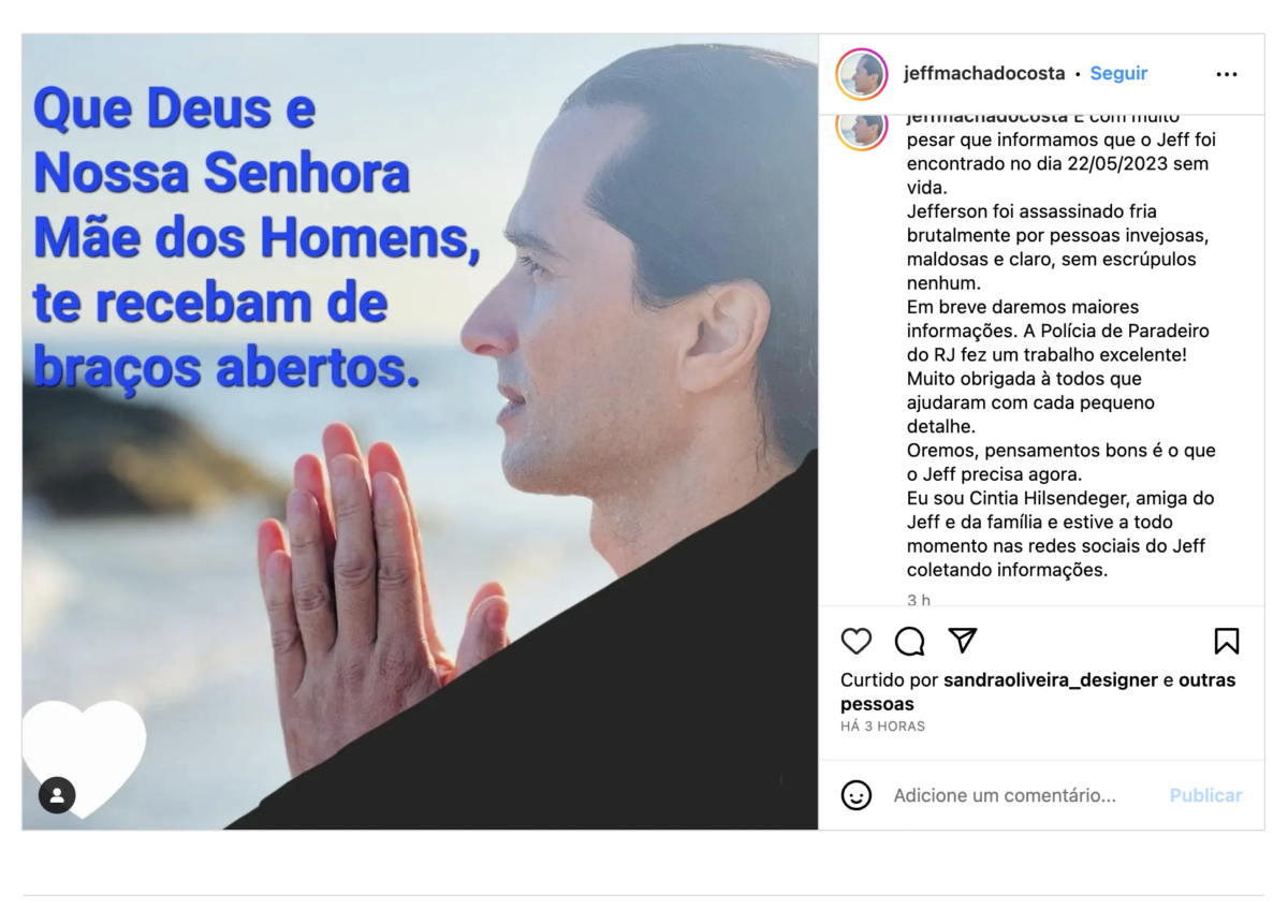 A notícia também foi publicada no perfil oficial de Jeff no Instagram: “É com muito pesar que informamos que o Jeff foi encontrado no dia 22/05/2023 sem vida. Jefferson foi assassinado fria brutalmente por pessoas invejosas, maldosas e claro, sem escrúpulos nenhum. Em breve daremos maiores informações. A Polícia de Paradeiro do RJ fez um trabalho excelente! Muito obrigada a todos que ajudaram com cada pequeno detalhe. Oremos, pensamentos bons é o que o Jeff precisa agora”.