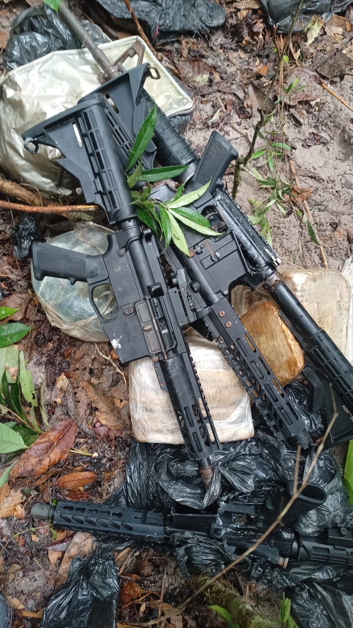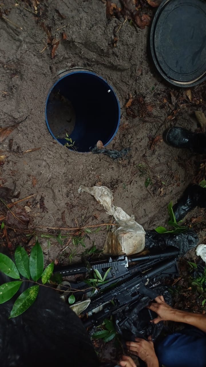Manaus – Na tarde desta terça-feira (26), a Força Tática da Polícia Militar apreendeu diversos tabletes de drogas e armas de fogo, incluindo um fuzil, em uma área de mata no conjunto Viver Melhor, localizado no bairro Santa Etelvina, zona norte de Manaus. O material estava enterrado no local e foi encontrado durante uma operação de busca.