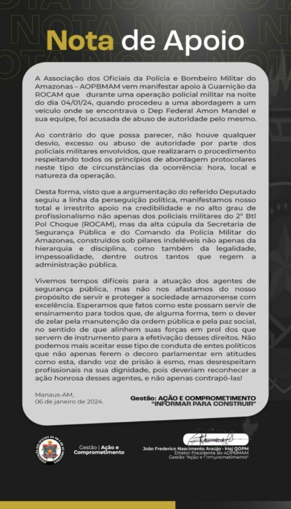 Manaus – A Associação dos Oficiais da Polícia e Bombeiro Militar do Amazonas (AOPBMAM) emitiu uma nota de apoio à Guarnição da Rondas Ostensivas Cândido Mariano (ROCAM) em meio à polêmica abordagem ao veículo do Deputado Federal Amom Mandel e sua equipe durante uma operação policial militar na noite de 04/01/24. O deputado acusou a guarnição de abuso de autoridade, desencadeando uma série de debates.