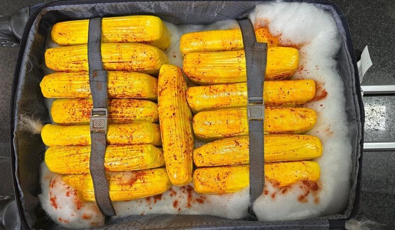 De acordo com a polícia, a droga foi localizada em bagagens despachadas de um voo comercial que tinha como destino o Aeroporto Internacional de Guarulhos, em São Paulo. Durante a inspeção, os agentes identificaram imagens suspeitas em três malas.