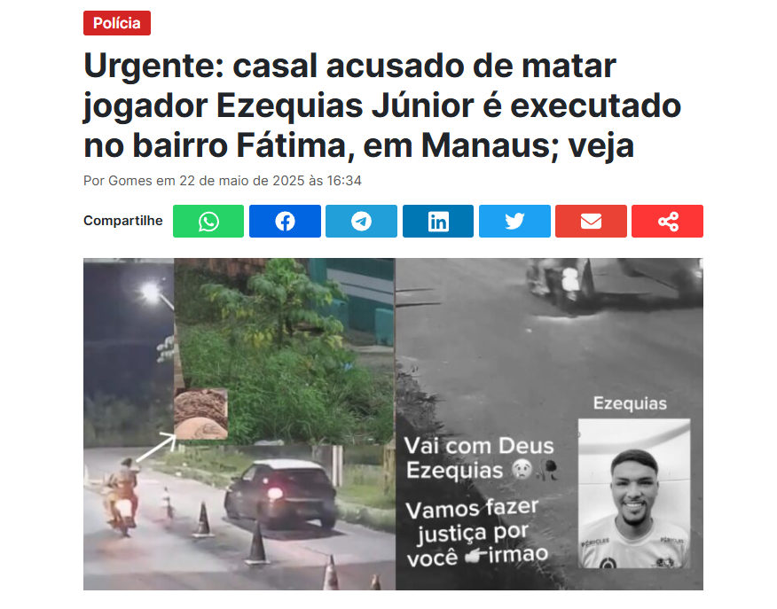 Na rua Galiléia, no bairro Nossa Senhora de Fátima, zona Norte, os corpos do casal Marcilene Rocha de Souza, de 27 anos, e John Nerison Pinto Farias, de 25 anos, foram desovados após serem executados a tiros. A polícia aponta os dois como suspeitos de envolvimento na morte de um jogador de futebol, mas a execução sumária, longe de representar justiça, escancara a força do crime organizado e a ausência do Estado.
