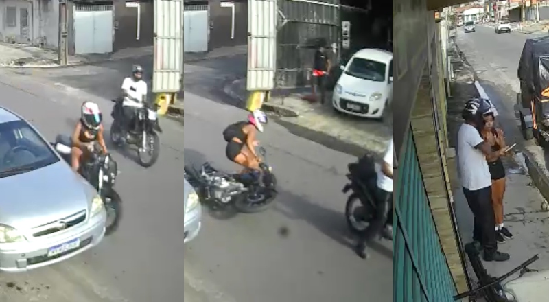 As imagens mostram o momento em que a motociclista, que levava uma mochila preta, é surpreendida por um criminoso em outra moto durante uma curva. Ao ser fechada pelo assaltante, a mulher se desequilibra e sofre uma queda brusca, colidindo contra um carro que estava estacionando e indo parar no chão junto com a moto.