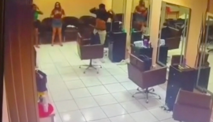 O vídeo mostra claramente o momento em que uma mulher é abordada por um dos assaltantes armados ao entrar no salão. Em seguida, outros dois indivíduos adentram o local.