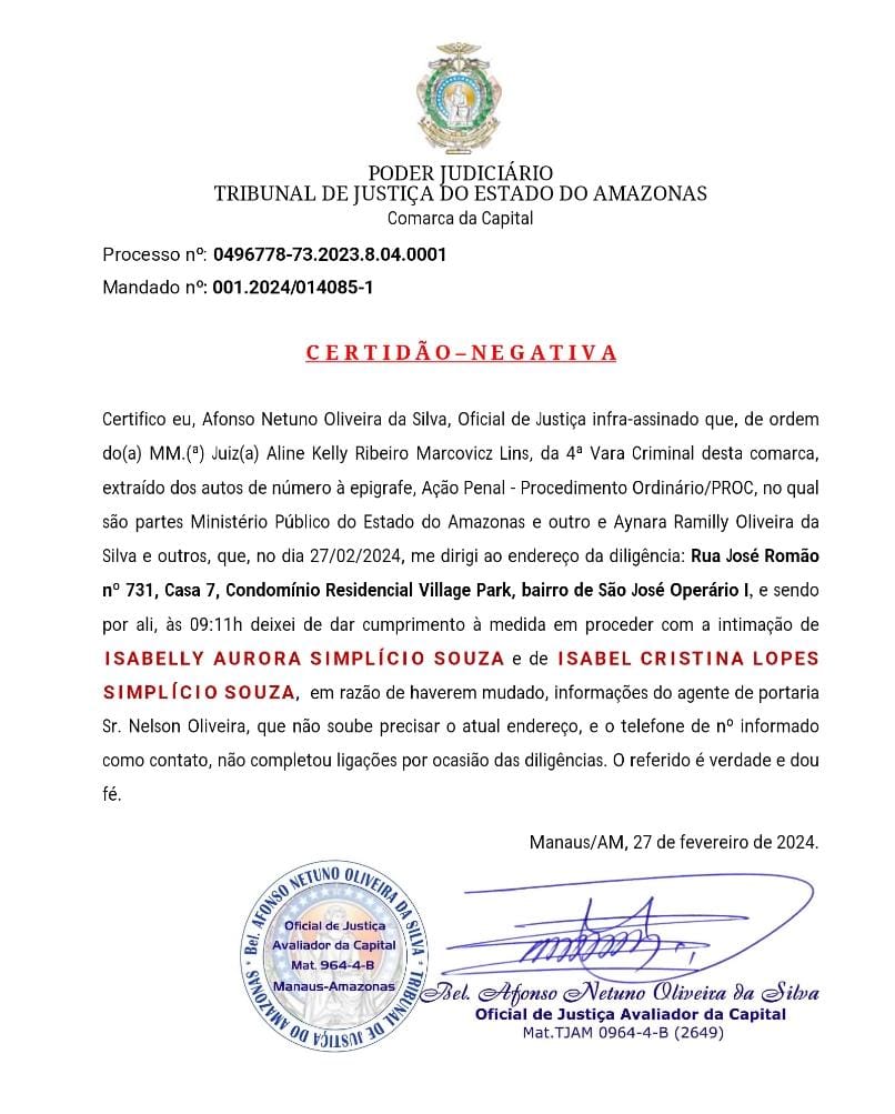 Segundo os Oficiais de Justiça, Isabelly teria deixado de comparecer mensalmente em juízo, além de ter mudado de endereço sem justificar.