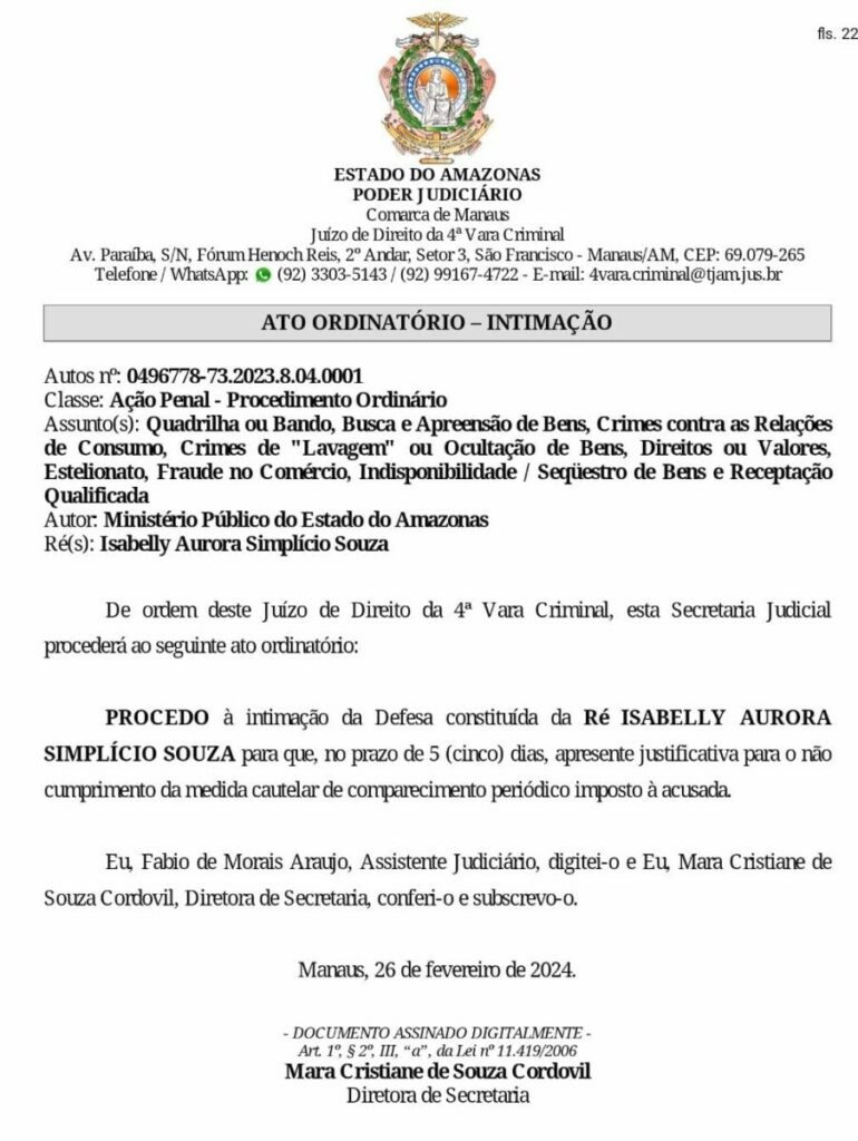 A Juíza Titular da 4ª Vara Criminal determinou que a blogueira justifique imediatamente o descumprimento das medidas estabelecidas que lhe permitiram responder o processo em liberdade, ou poderá sofrer graves consequências.