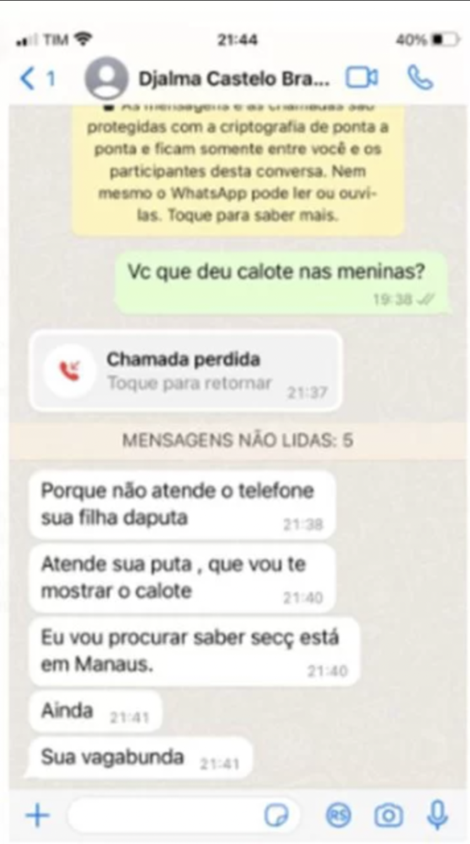 Djalma não teria pago as outras meninas que participaram da orgia e teria ameaçado a jovem paulistana de morte pela cobrança. “Ele chegou a mandar dois capangas até o quarto de hotel em que eu estava hospedada, mas, por sorte, eu havia trocado de suíte por conta de uma infiltração. Com isso, os homens não me encontraram. Uma pessoa me ajudou e consegui voltar para São Paulo”, detalhou a garota.