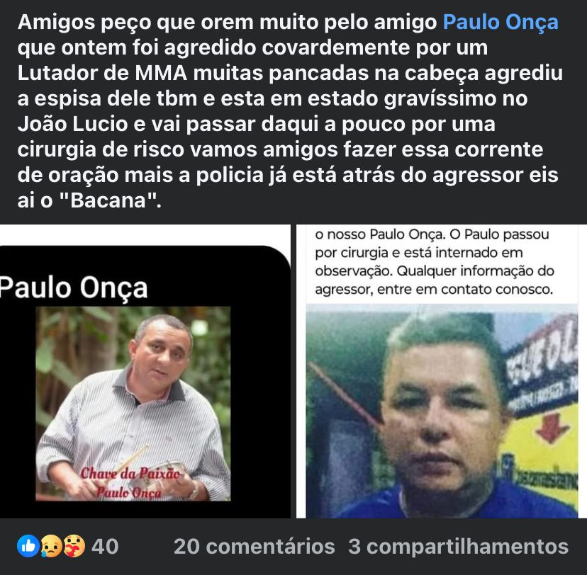 O cantor, que é conhecido por sua carreira musical e por seu envolvimento com a cultura amazonense, ficou gravemente ferido durante a briga. Ele foi socorrido e encaminhado ao Hospital e Pronto Socorro (HPS) João Lúcio, onde permanece internado. O filho de Paulo Onça informou que o o pai passou por cirurgia na manhã desta quinta-feira (5) e o estado de saúde é grave.