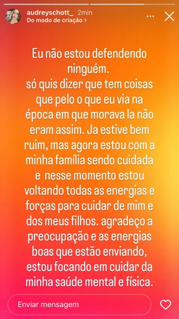 Após o pronunciamento, Audrey apagou os stories em que defendia o marido das acusações de estupro. Em seguida, ela postou um único vídeo, em que declara que está bem, e uma imagem dizendo que não está defendendo ninguém.