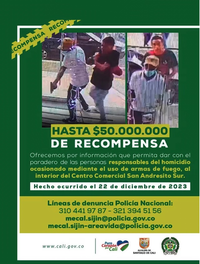 Diante do homicídio, as autoridades locais lançaram uma oferta de recompensa significativa para identificar e capturar os responsáveis pelo ataque. A prefeitura de Santiago de Cali anunciou uma recompensa de até 50 milhões de pesos (equivalente a R$ 300 mil) por informações que levem à rápida identificação dos autores materiais e intelectuais do crime, conforme declarou o secretário de Segurança, Jimmy Dranguet.